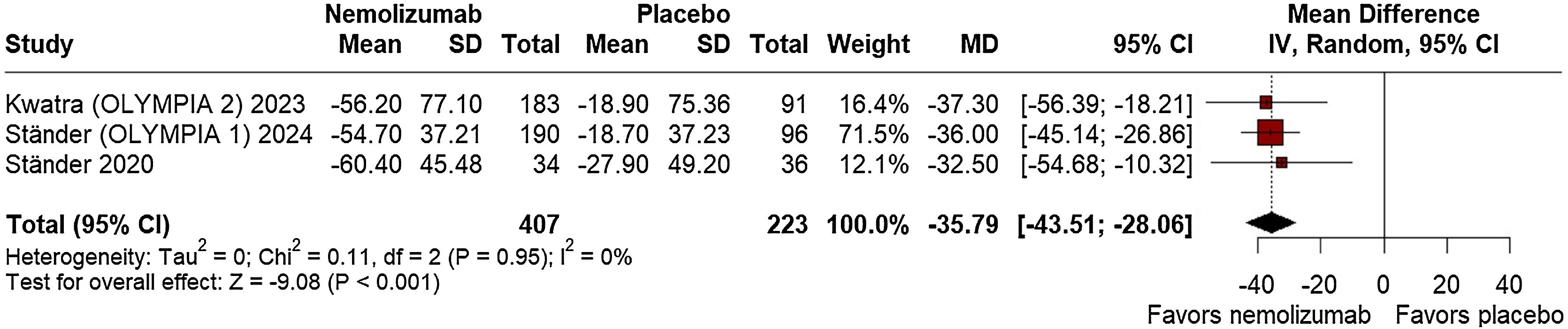 ResultsThree trials, involving 630 patients, were included. Nemolizumab significantly reduced pruritus at week-4 (MD = −32.04; 95% CI: −38.47, −25.62) and at week-16 (MD = −347.34; 95% CI: −1039.71, 345.04). Investigator’s Global Assessment (IGA) success favored Nemolizumab at week-16 (RR = 3.50; 95% CI: 2.18, 5.63). No significant differences were observed in adverse events (RR = 1.10; 95% CI: 0.97, 1.25) or serious adverse events (RR = 0.77; 95% CI: 0.43, 1.39). Nemolizumab also significantly reduced neurodermatitis.