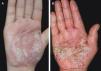 Palmoplantar pustulosis (PPP) is a chronic, relapsing, inflammatory skin disease that is restricted to the palms and soles. PPP appears more frequently in middle-aged adults and women, and usually develops resistance to therapy.1 Various factors such as metal allergy, cigarette smoking, infection, and thyroid disease are associated with PPP.2,3 Erythema, sterile pustules, and scales are common clinical features. Histopathology shows parakeratosis, psoriasiform epidermal hyperplasia, spongiosis, and pustules filled with neutrophils. PPP shares many clinical and histological features with generalized pustular psoriasis (GPP), thus PPP is considered to be a localized type of GPP.4 GPP presents as edematous erythema, with sterile pustules all over the body.