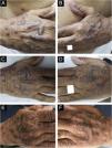 Evolution of chronic prurigo nodular lesions in an 87-year-old man before (2019) and after treatment with dupilumab. Sequential evolution of isolated or confluent infiltrated and excoriated hyperkeratotic nodules on the patient's hands. (A) Right aspect and (B) left aspect at initial consultation (note erosions and excoriations over nodules). (C) and (D), fewer excoriated lesions at the end of the first month of treatment with dupilumab; (E) and (F), after four months of dupilumab monotherapy, the infiltrated and hyperkeratotic nodules showed significant regression and no erosions or excoriations were observed. After three years of monitoring the treatment with dupilumab (2019‒2022), the patient turned 91 years old, using 300 mg once a month, and denied pruritus with the Visual Analogue Scale (VAS) for pruritus constantly 0 for the last two years.
