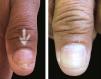 Case 1. We report a 45-year-old female patient with nail dystrophy for 2 years referred for onychomycosis treatment. She presented with exuberant subungual hyperkeratosis and discrete cupuliform depressions, in addition to erythema, periungual edema, and pain in the right hallux (Figure 1). No changes were observed in the other nails. We observed no other alterations on physical examination. Direct mycological examination, repeated weekly for 4 weeks, was always negative. MRI of the hallux confirmed the diagnosis of psoriatic arthritis, initially monoarticular. We started treatment with systemic MTX and continued for 3 months with no response. Then, we used leflunomide for 12 months. The patient reported improvement of joint pain, but we observed a worsening of nail dystrophy. No clinical change was observed after one year. Then, we opted for intralesional infiltration with methylprednisolone, with no improvement. Finally, we used intralesional infiltration with MTX 25 mg/ml (Figure 2). Case 2. A 60-year-old male patient with psoriasis in small plaques affecting seven fingernails. The initial treatment consisted of topical occlusive therapy with calcipotriol and betamethasone associated with infiltrations of methotrexate at 25 mg/ml (Figure 3). The treatment with MTX consisted of the infiltration of 0.1 ml (2.5 mg) per affected nail, every 30 days, for 3 consecutive months. As the applications occurred at the level of the proximal nail fold, in the case of the hallux, the dose was divided with an interval of 1cm. No anesthetic nerve block was performed and patients reported pain. After the third infiltration, the patients demonstrated an evident improvement. Five months after the first application, they still presented a good evolution.