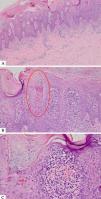 Necrolytic acral erythema is one of the necrolytic erythemas, which include necrolytic migratory erythema (NME), acrodermatitis enteropathica, and various dermopathies secondary to nutritional deficiencies. NAE is distinct from the other necrolytic erythemas by virtue of its consistent association with hepatitis C (HCV) together with the acral distribution of its lesions.4 Acute lesions of NAE present as erythematous papules and blisters that eventually lead to dark red erosions with a characteristic acral distribution. As for established lesions, sharply defined hyperkeratotic erythematous to violaceous plaques develop, and crusts may be seen. 5 Patients may report associated itching, burning, or aching pain in the lesions. NAE may mimic psoriasis, pellagra, or chronic eczema, but its characteristic histopathological features that demonstrate psoriasiform epidermal hyperplasia and superficial necrotic keratinocytes that vary according to the chronicity of the lesions, on a background of a distinct acral distribution without nail involvement, help in preventing misdiagnosis. 6 The pathogenesis of NAE is unclear. Hepatocellular dysfunction and low serum levels of amino acids, glucagon, and albumin that are associated with chronic HCV infection are proposed as playing a role in the development of the disease .7